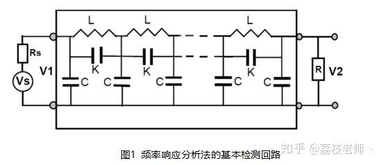 变压器绕组的幅频响应特性采用图1所示的频率扫描方式获得。连续改变外施正弦波激励源VS的频率f(角频率ω=2πf),测量在不同频率下的响应端电压V2和激励端电压V1的信号幅值之比,获得指定激励端和响应端情况下绕组的幅频响应曲线。图中:L、K及C分别代表绕组单位长度的分布电感、分布电容及对地分布电容,V1、V2分别为等效网络的激励端电压和响应端电压,VS为正弦波激励信号源电压,RS为信号源输出阻抗,R为匹配电阻。